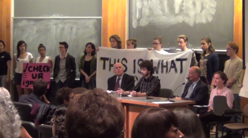 Walsh, who was seated at the front of the room along with fellow MJ member Laura Rigell ‘16 and Board members including Chair Gil Kemp ‘72, began speaking into his microphone during a momentary pause in Niemczewski’s speech. Walsh read a prepared statement as the 100-or-so students marched in and encircled the room holding posters and banners marked with slogans like “This is what social responsibility looks like” and “Check your ignorance.”