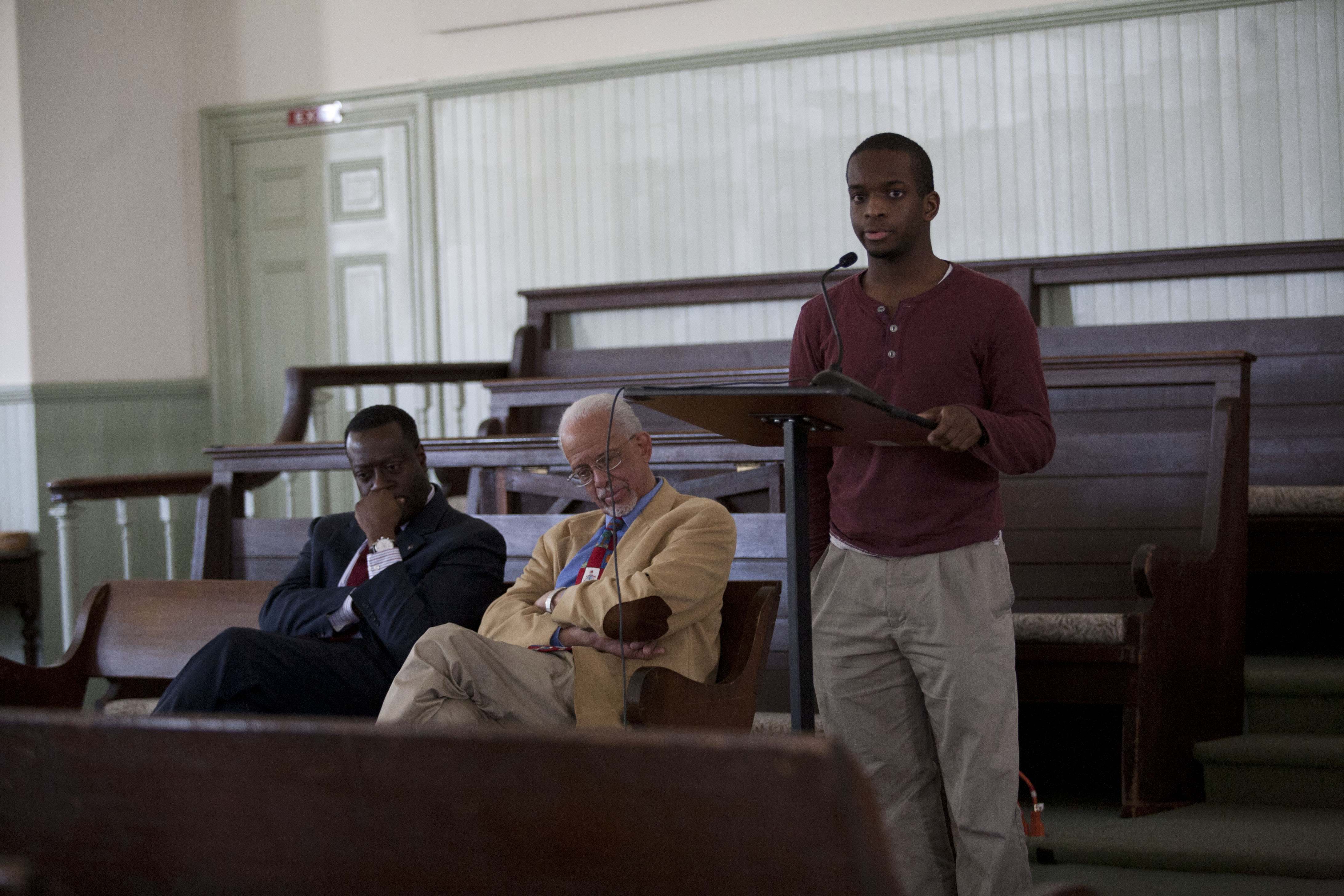Guest speakers Maurice Eldridge, Professor Keith Reeves, and Paul Cato ’14 speak at the Friends Meeting House as part of Swarthmore’s Martin Luther King week